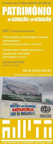 A convite da Associação de Defesa do Património de Torres Novas, Juliana Campuzano Botero doutoranda e Diana Bogado pos-doutoranda apresentaram em Torres Novas o trabalho desenvolvido no Museo Comunitario San Jacinto, Bolívar Colombia e no Museu das Remoções da Vila Autódromo do Rio de Janeiro. As apresentações tiveram lugar no espaço exterior da Sede da ADPTV e mostraram com em lugares tão distintos a Museologia comprometida com o desenvolvimento pode ser um fator essencial de exercício de Responsabilidade Social.