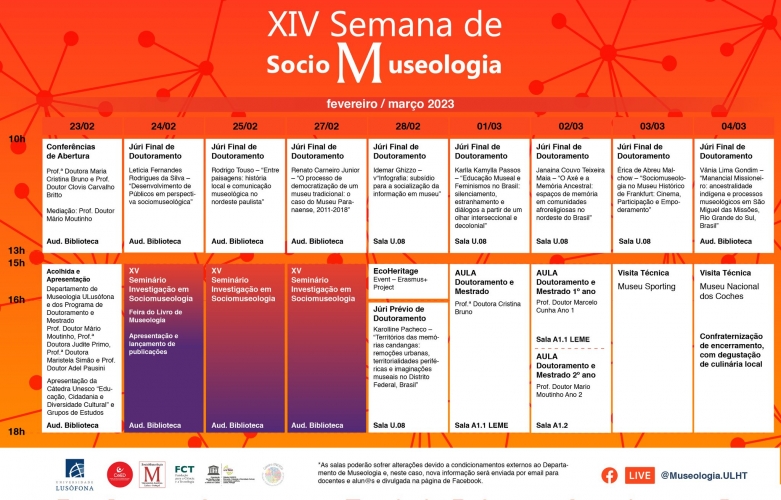 Por favor, encontrem anexos o programa da Semana com indicações de temáticas, horários e locais, e também do XV Seminário de Investigação em Sociomuseologia, que tem lugar de 24 a 27 de fevereiro, e é parte da avaliação curricular do segundo ano dos Programas de Doutoramento e Mestrado.