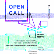 The Artistic Studies Research Center (CIEBA) of the Faculty of Fine Arts of Lisbon University (FBAUL) and the Research Centre for Education and Development (CeiED) of the Universidade Lusófona de Humanidades e Tecnologias (ULHT) invites you to submit a proposal for a paper and/ or an artwork to the upcoming POST-SCREEN 2016: International Festival of Art, New Media and Cybercultures to be held in November, in Lisbon, Portugal.