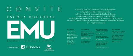 O Diretor do CeiED e os Diretores dos Cursos de Doutoramento em Educação, Museologia e Urbanismo convidam V. Exª para a Sessão de Apresentação da EMU Escola Doutoral, e, simultaneamente, para a Abertura do Ano Letivo 2014-2015 dos seus cursos, que se realiza no próximo dia 23 de Janeiro de 2015, às 14.30 horas, no Auditório Armando Guebuza da Universidade Lusófona de Humanidades e Tecnologias, com o Programa que se junta.